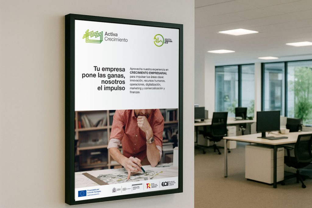 A partir de esa base, el reto consistió en dar continuidad a la identidad y desarrollar la imagen específica de cada programa, manteniendo coherencia visual con el conjunto, pero aportando personalidad y diferenciación a Activa Crecimiento, centrado en el impulso de pymes industriales.