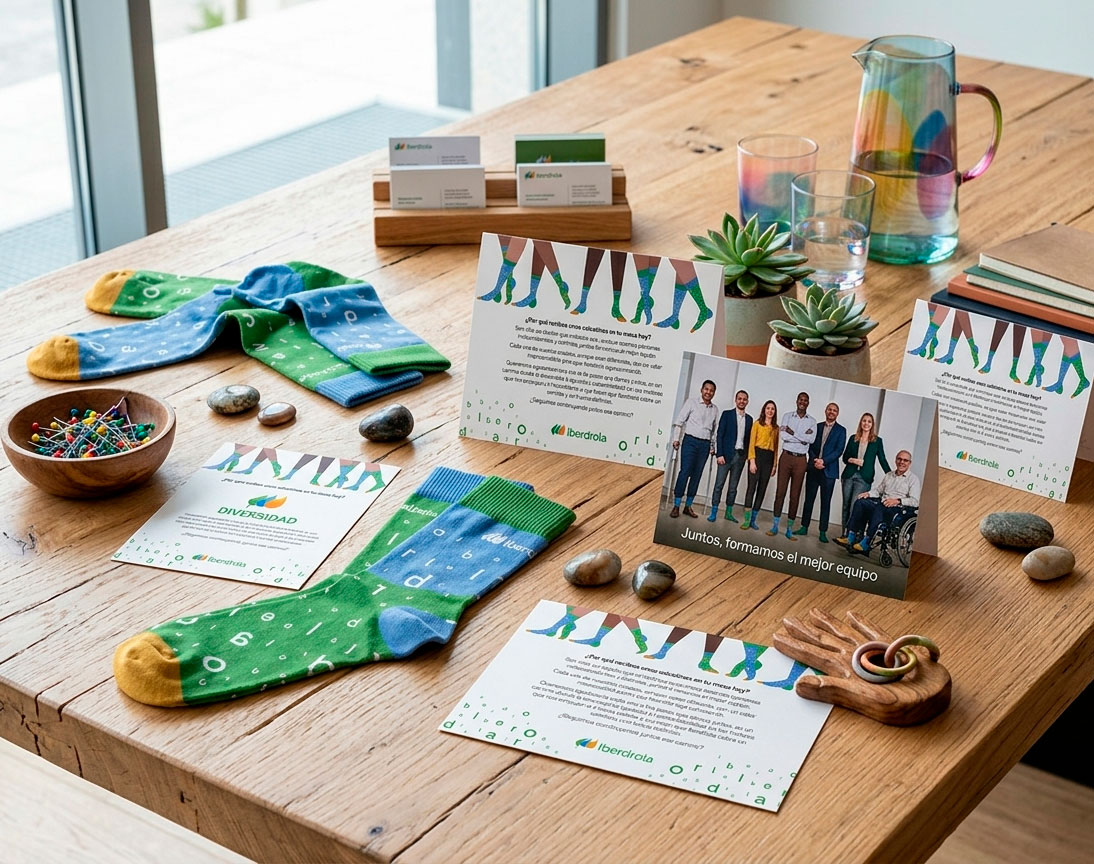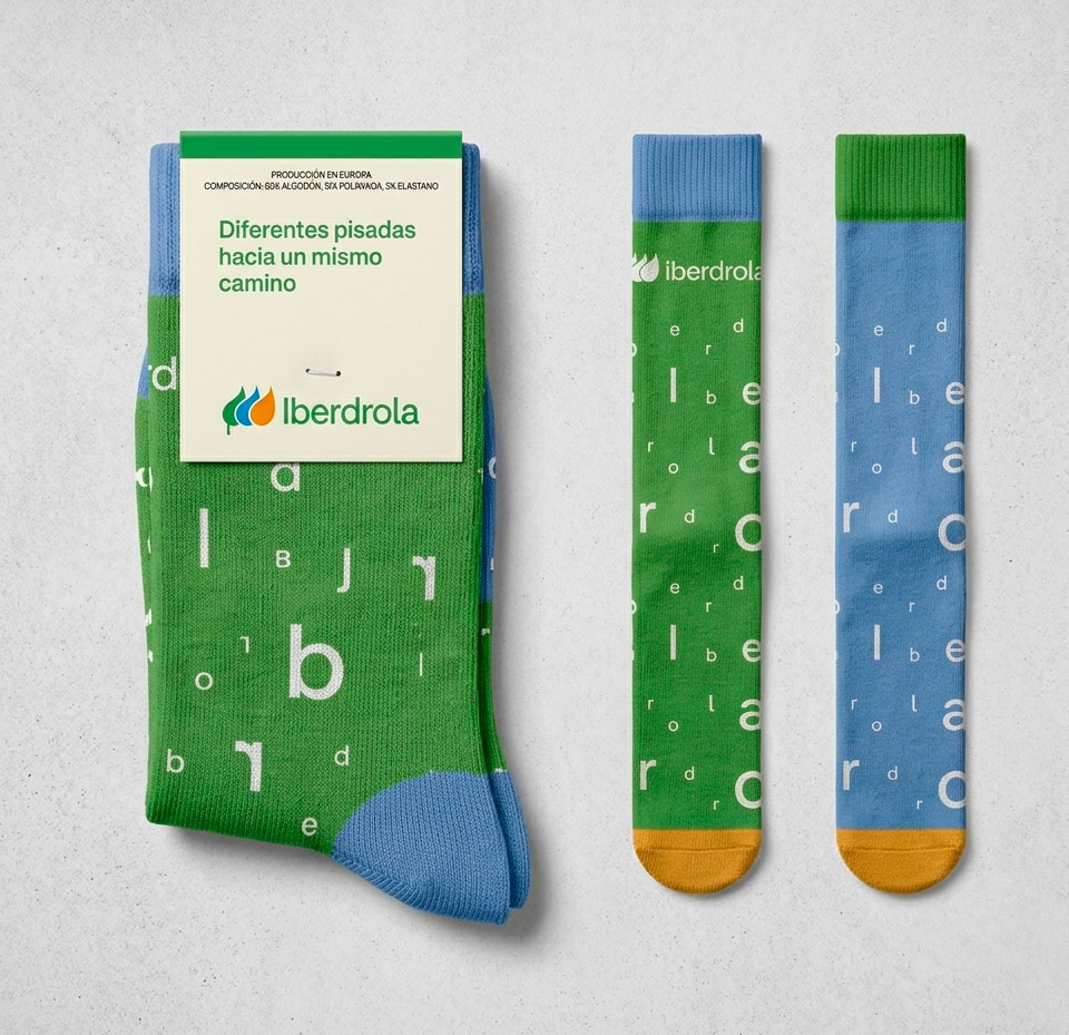 Campaña de diversidad para Iberdrola bajo la dirección de X-ternal. El proyecto utiliza el diseño de calcetines como hilo conductor, aplicando un juego tipográfico basado en el logo de la compañía. El conjunto se completa con un tarjetón que redondea la experiencia y el mensaje de inclusión